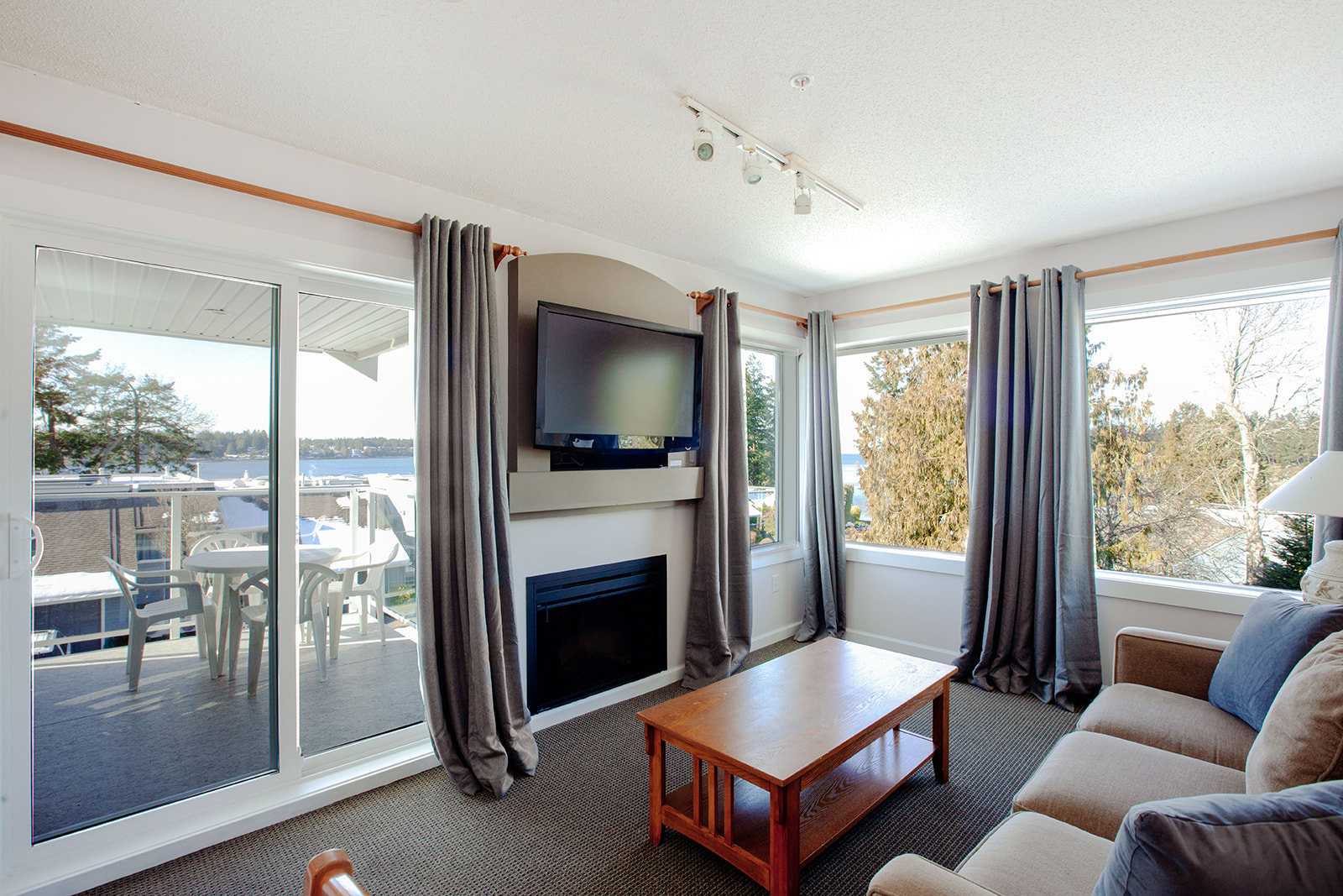 The living room features a fireplace, Smart TV, and pictures windows with panoramic ocean views and mountain views. Guests can enjoy year-round access to the covered deck from the living room. The deck is furnished with 4 outdoor chairs and a patio table.