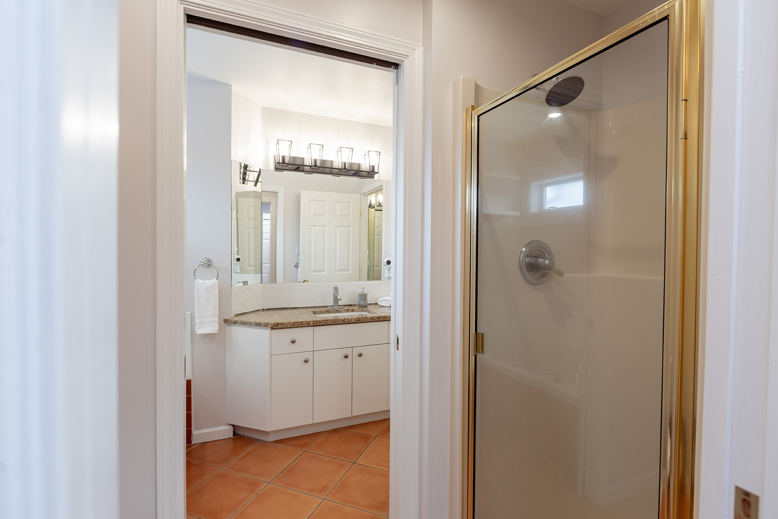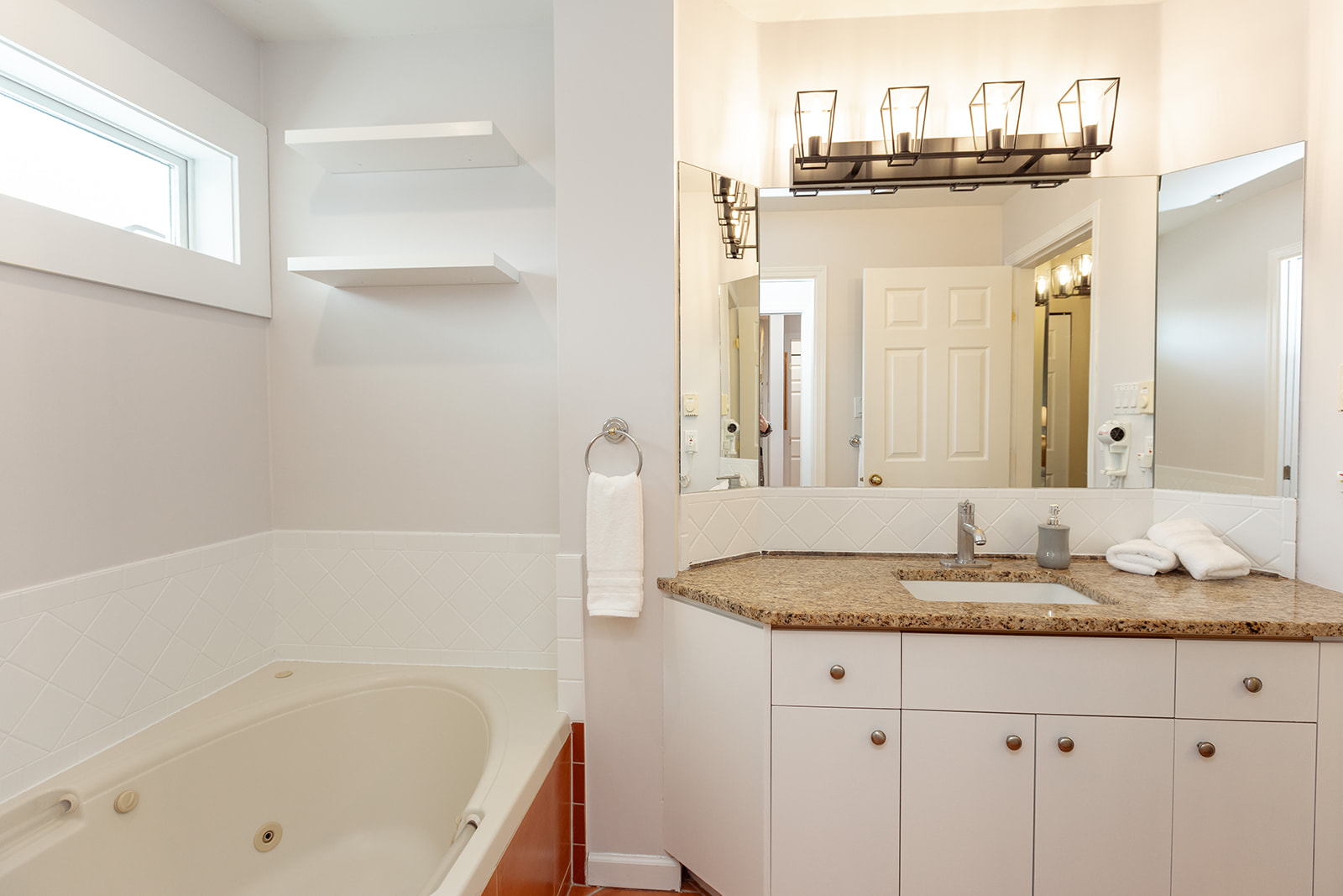 The bathroom doubles as an ensuite and offers a privacy door to separate the bathroom from the bedroom. The bathroom features heated floors, a jacuzzi tub, and stand alone shower. Bathroom essentials are provided: shampoo/conditioner/body wash.