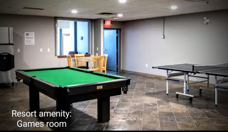 Indoor games room with ping pong and a pool table.