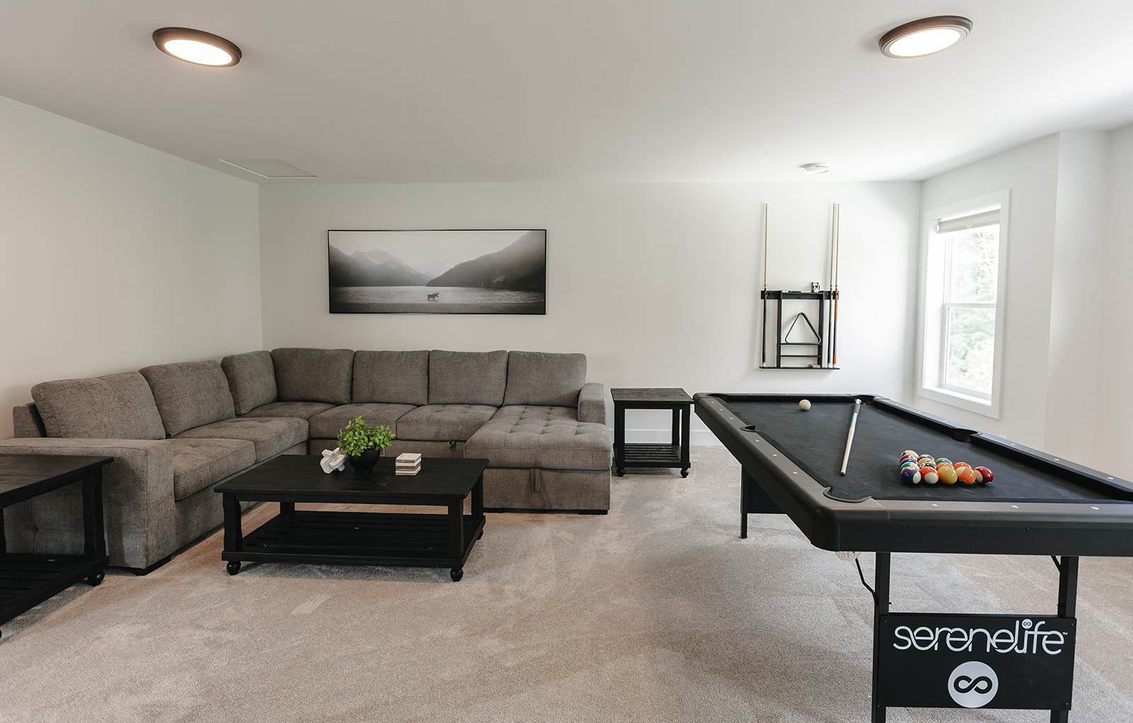 - Recreation room with pool table, built-in bar, large sectional couch, and Smart TV